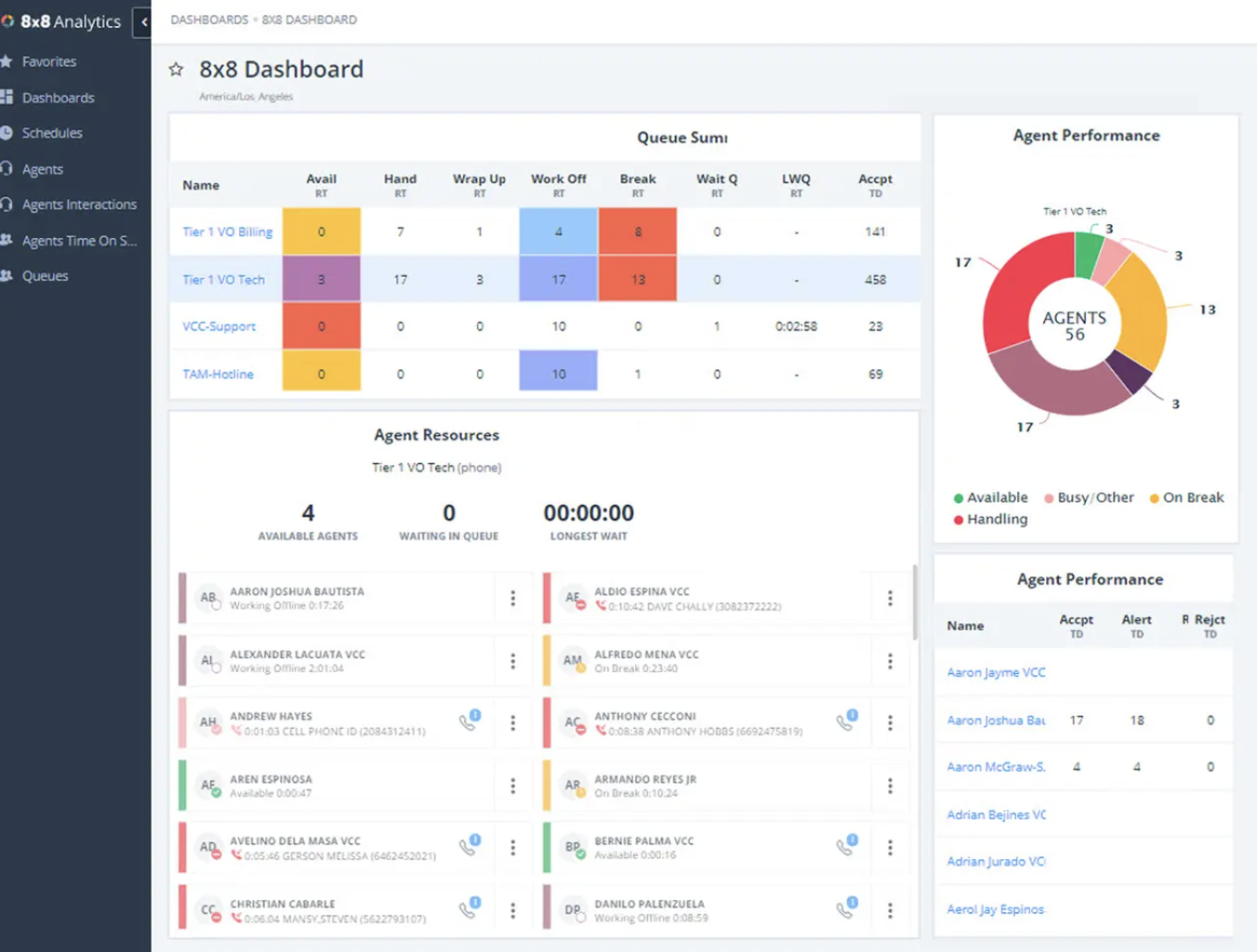 - Queue Status Specifics: Displays information about current queues such as longest wait time, average speed to answer, and offered vs. handled