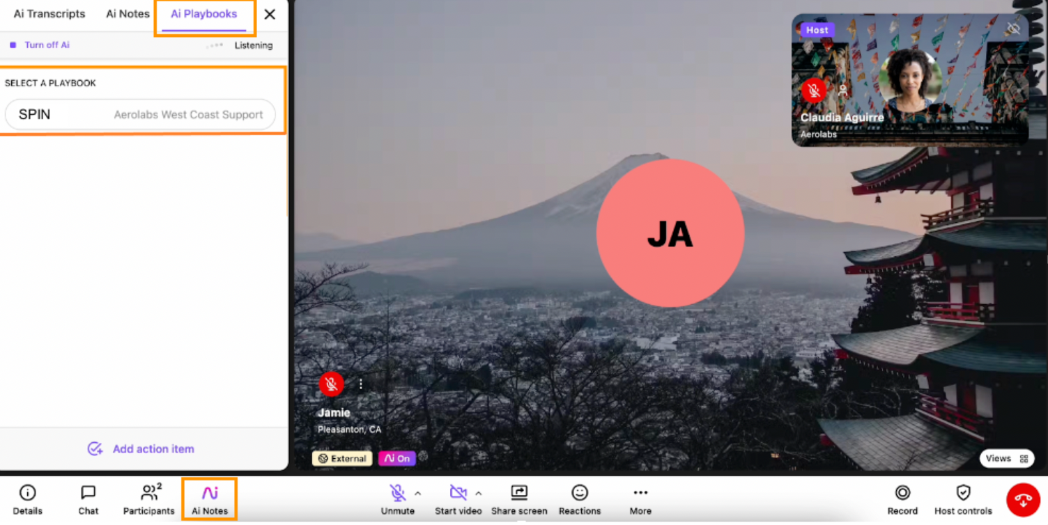 Agents can view the AI playbook in real time in the AI Notes tab on the dashboard. It remains accessible even while screen sharing. The AI can detect when specific topics are addressed, specific questions are asked, etc.