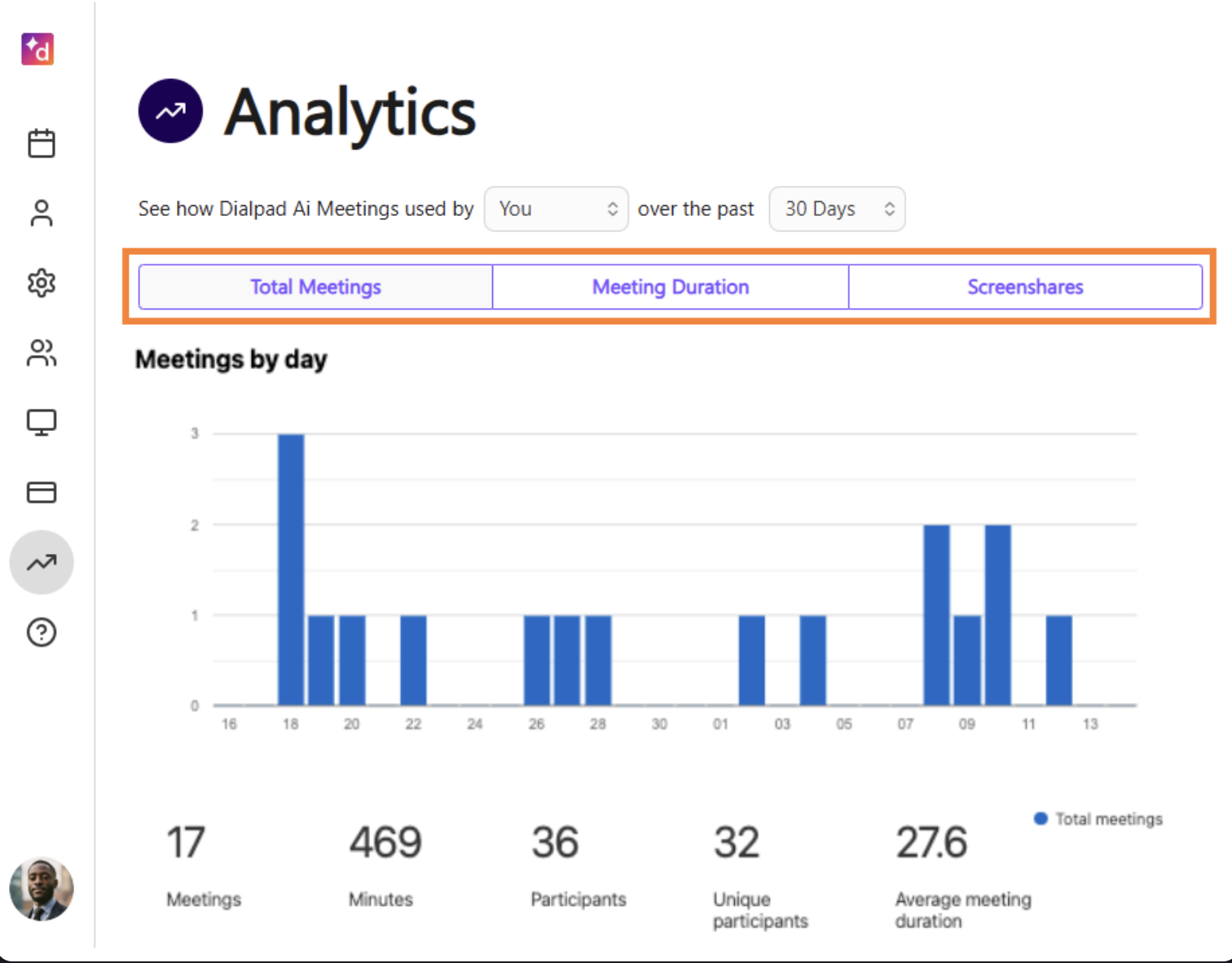 The Dialpad Meetings Analytics dashboard provides admins with historical data and KPIs about each team’s and agent’s activity and Meetings usage. Only included with the Pro plan, the analytics dashboard includes a visual display of when meetings occurred, how long each meeting lasted, and the number of screen shares per meeting.
