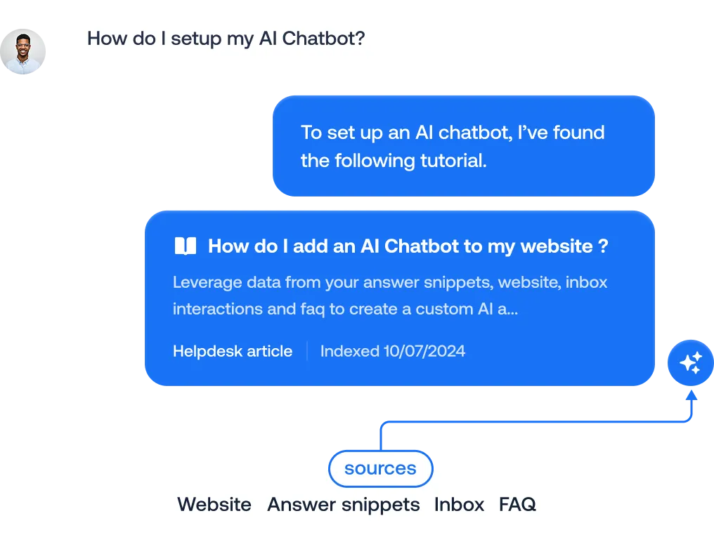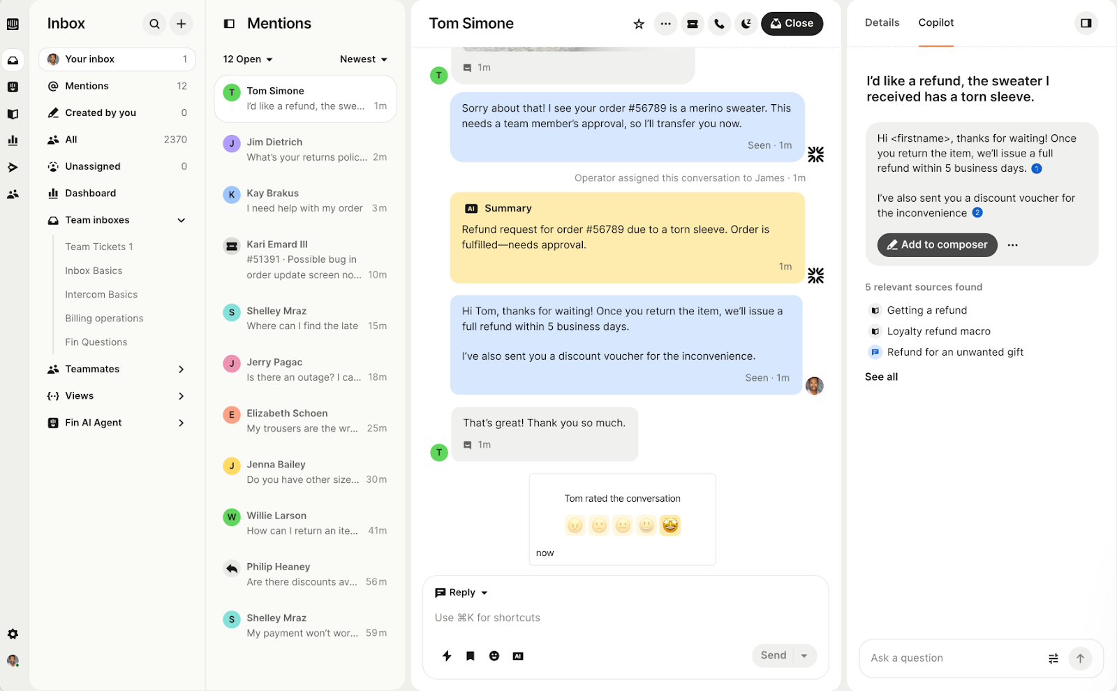 - AI Copilot: Provides agents with suggested responses during conversations, summarizes long threads, detects customer sentiment, recommends knowledge base articles