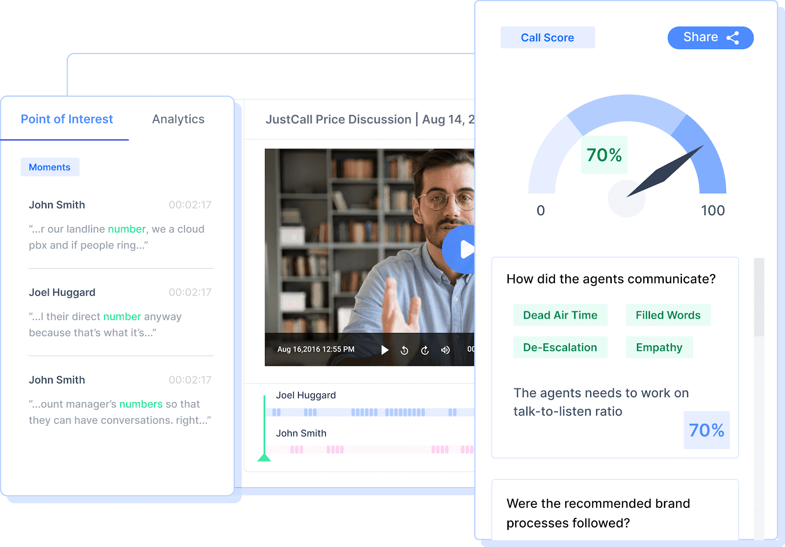JustCall is a proven and scalable solution that packages together robust VoIP calling, comprehensive SMS and WhatsApp messaging, an array of sales dialers, active and handy AI coaching capabilities, as well as offering seamless CRM integrations. All elements come together to aid sales and support teams maximize productivity and customer engagement.