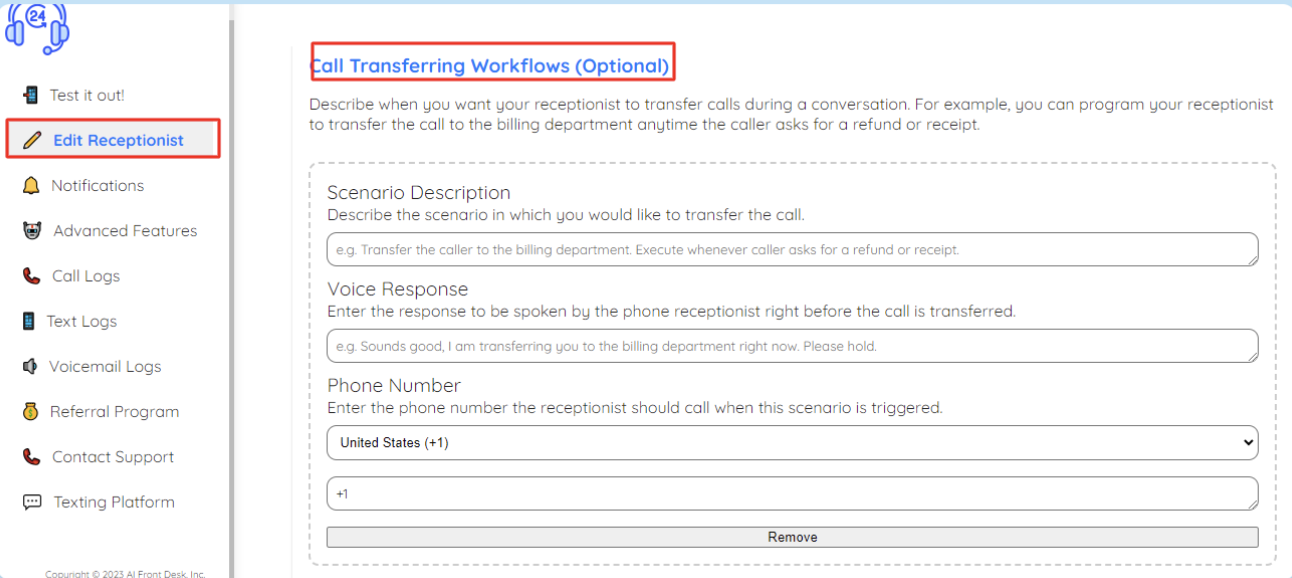 With My Front Desk AI, you can set up workflows that will transfer calls to the appropriate agent based on keywords and phrases. It should be noted that My Front Desk AI limits the number of workflows you can have based on the pricing plan.