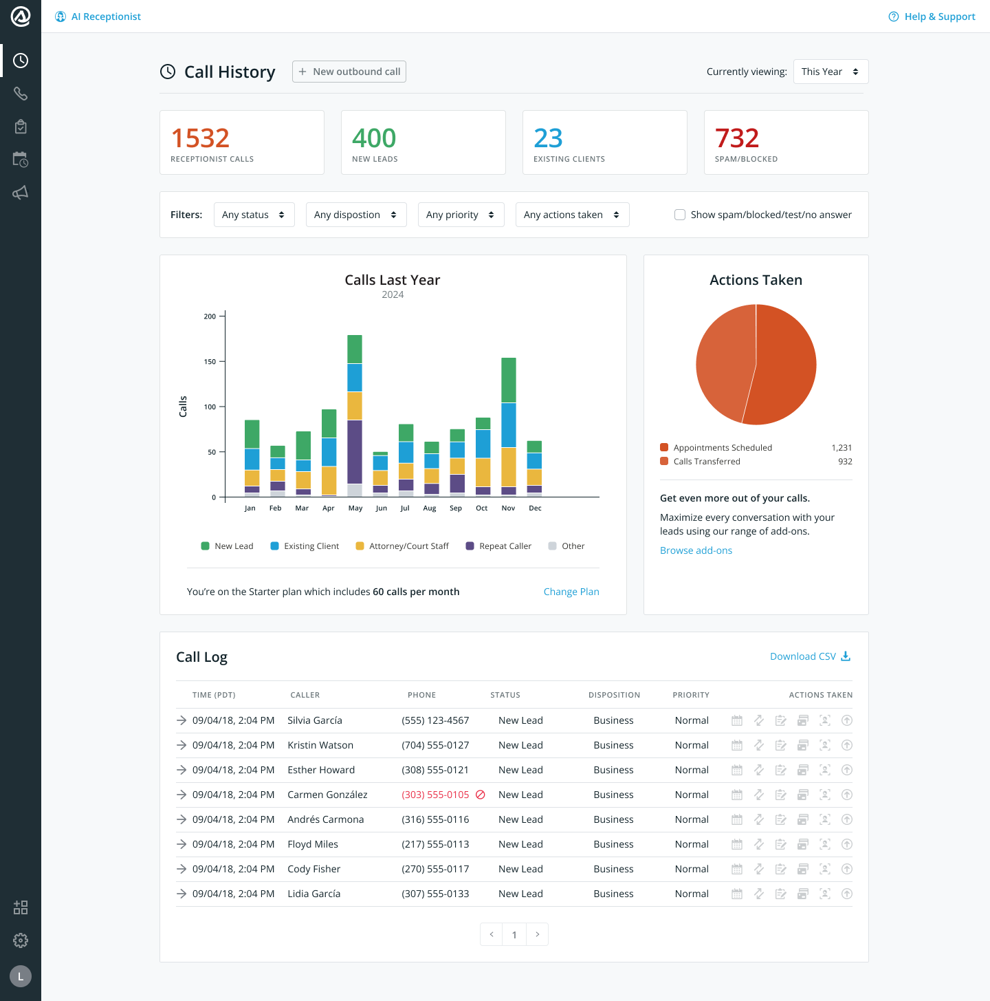 | Best For | Sales teams that need assistance with call answering, lead sorting, and note taking | Law firms and service industry teams that need an AI receptionist to conduct intake and answer questions |