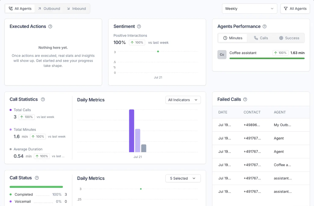 Synthflow offers a real-time analytics dashboard that updates every hour. Data can be filtered by specific agents, inbound/outbound calls, time ranges, etc.