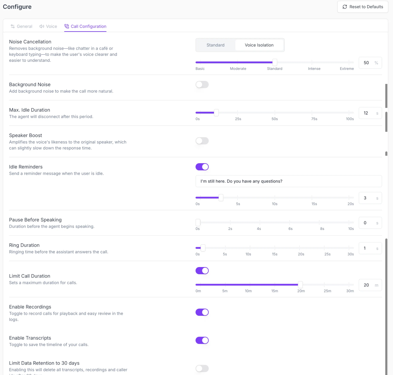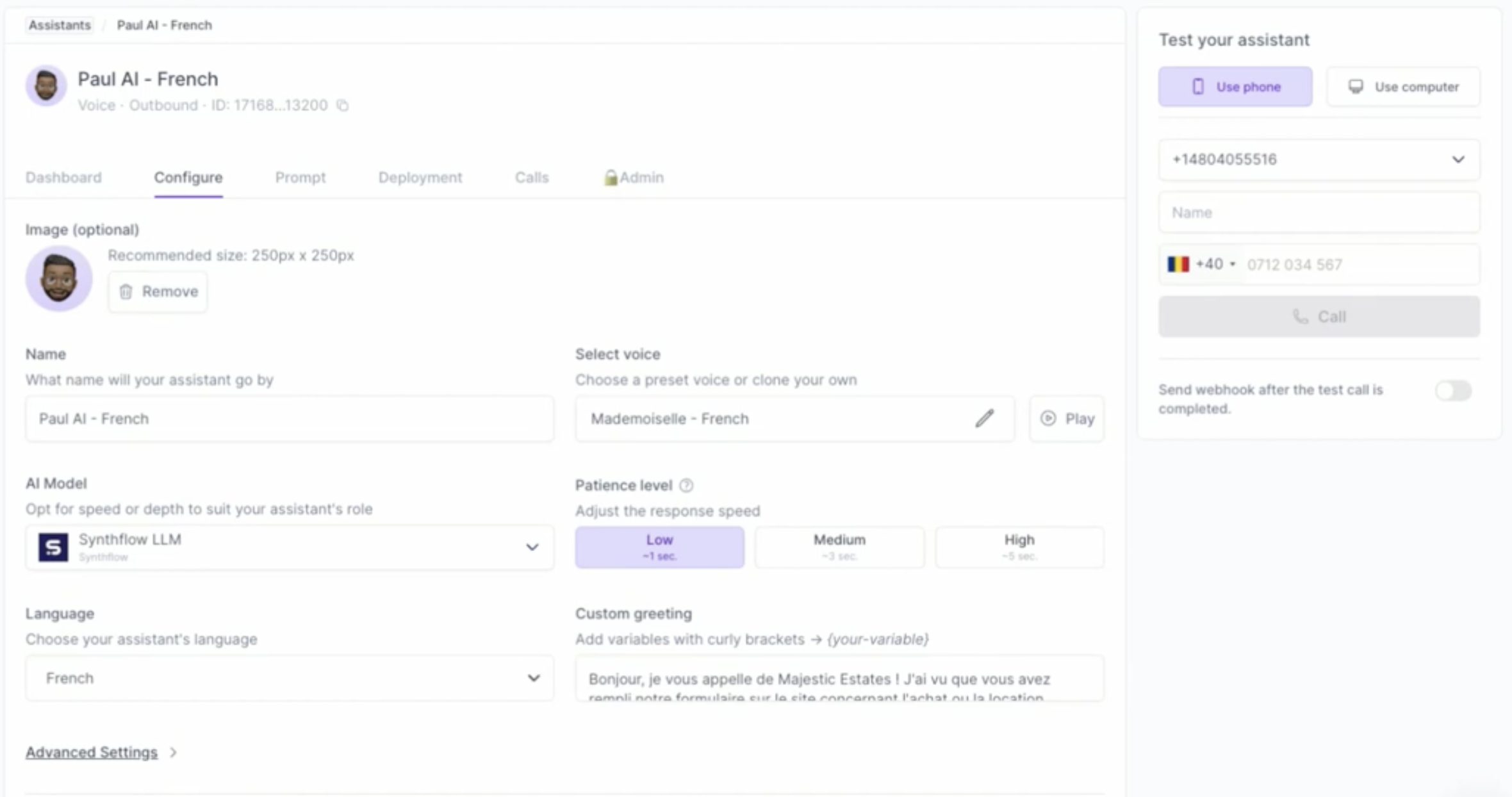 Synthflow has many customization options for AI Receptionists. Admins select the language and accent, choose from a number of voice options, or clone a voice.