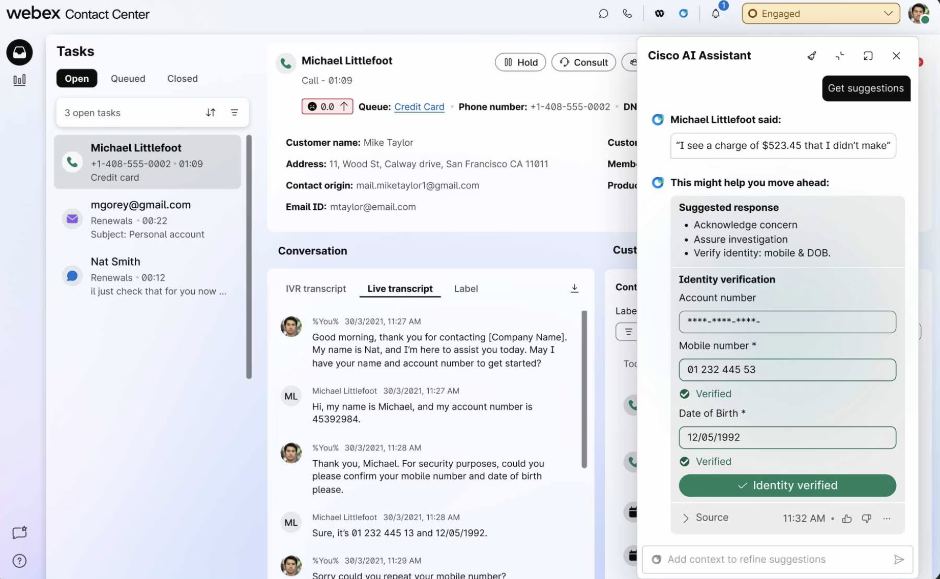 Webex's AI Assistant leverages natural language processing, machine learning, and business intelligence to help agents anticipate customer needs, streamline workflows, get the information they need quickly, and deliver faster, more personalized customer service.